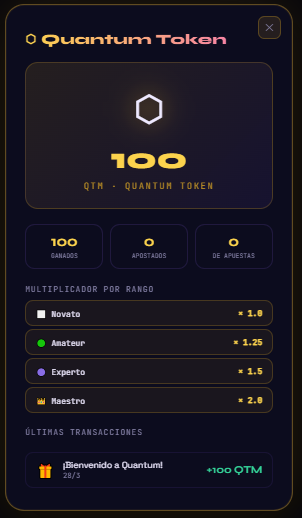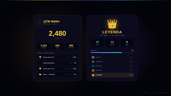 Chess with bets Challenge a friend to a full online chess match and put your QTM tokens on the line. Win to climb the rank ladder — from Novato all the way to Leyenda — and unlock multiplier bonuses on your rewards.